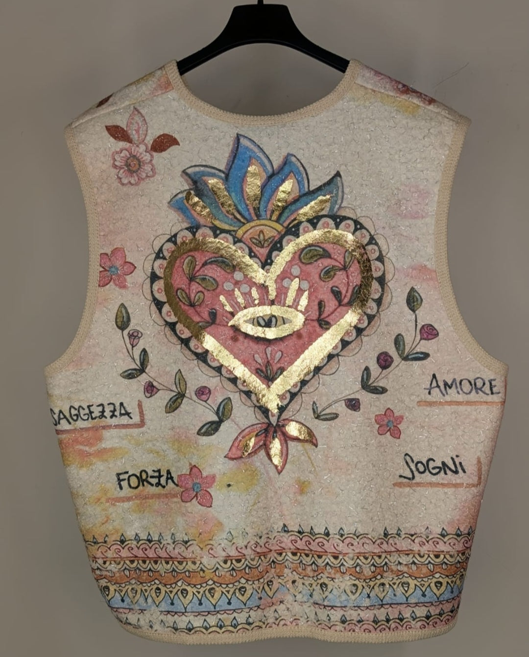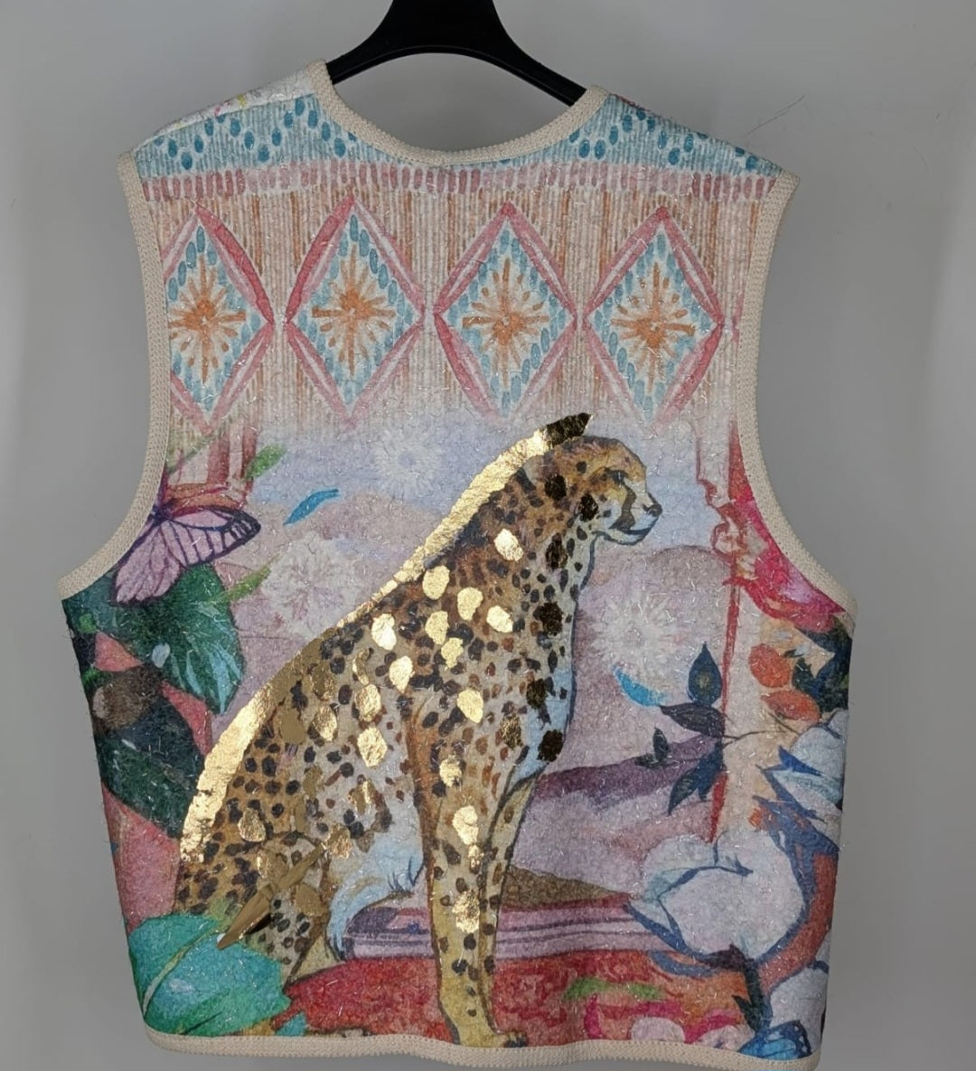 Dit unieke bodywarmer is een echte eyecatcher dankzij de rijke mix van prints, kleuren en kunstzinnige details. De speelse combinatie van bloemen, een luipaard, vlinder en typografische elementen zoals “love” geeft dit item een uitgesproken en creatieve uitstraling.