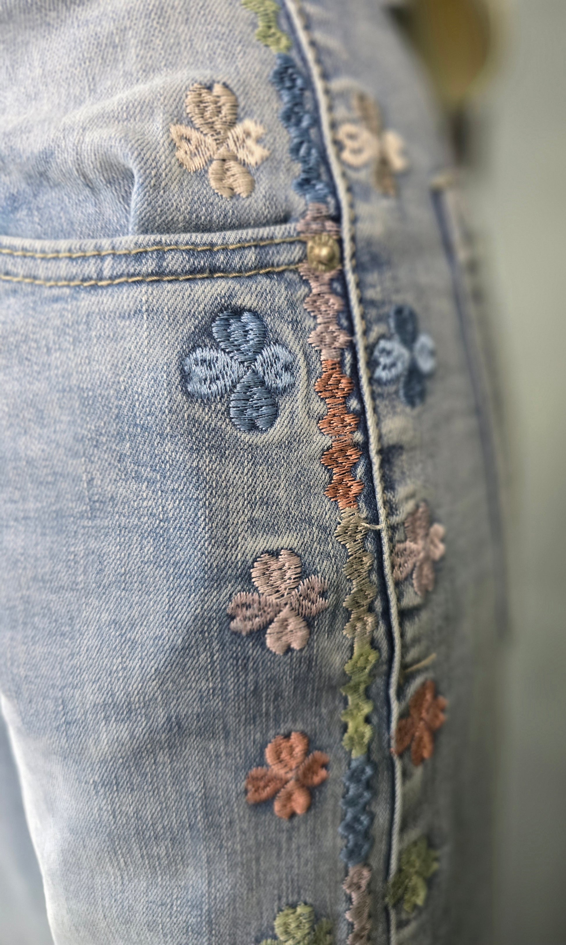 - Details: geborduurde bloemen langs de zijkanten van de pijpen