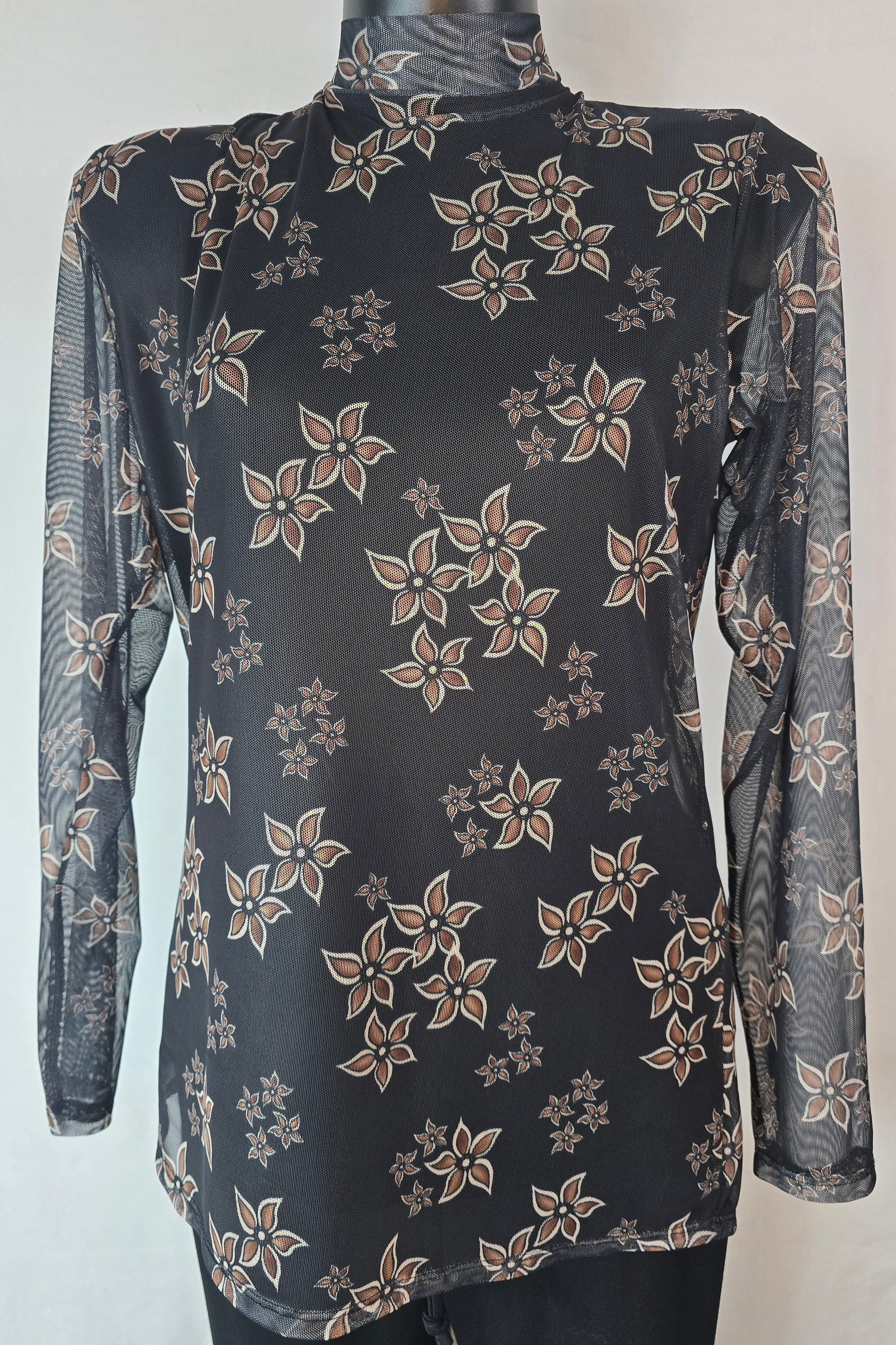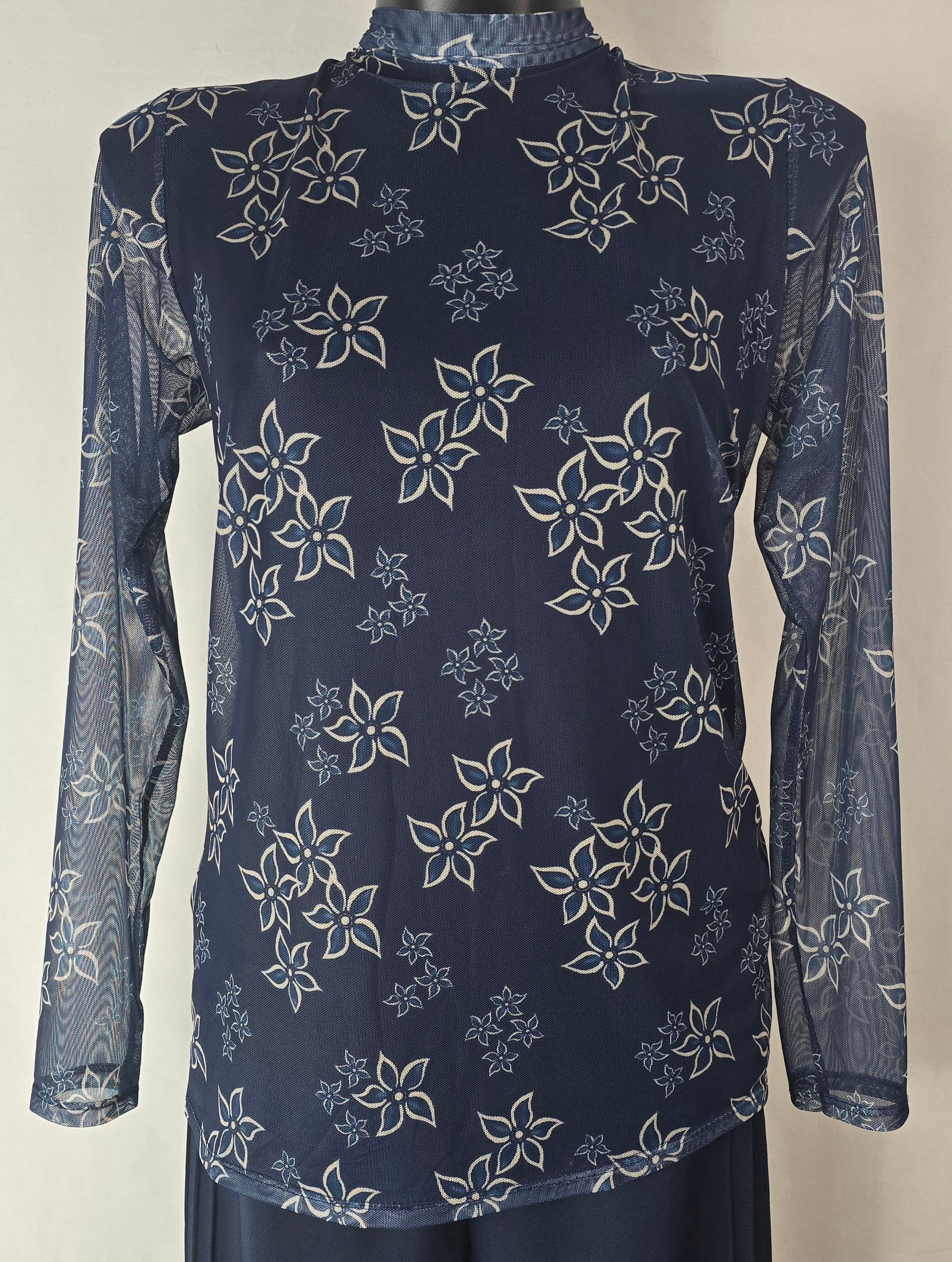 Deze stijlvolle navy en zwart top is gemaakt van een lichte, semi-transparante stof en valt soepel om het lichaam. De top heeft lange mouwen en een subtiele opstaande hals voor een verfijnde uitstraling. Het bloemenmotief in zachte, contrasterende tinten geeft het geheel een vrouwelijke en moderne look.